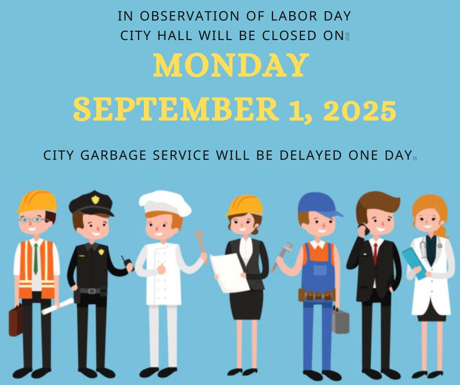 City Hall will be closed on Monday, September 1, 2025 in observation of Labor Day. Garbage services will be delayed one day.